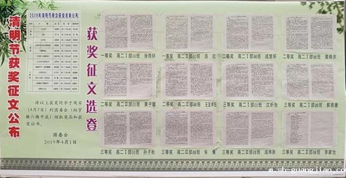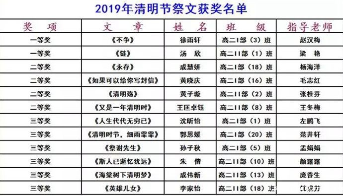 高二年级各班学生高度重视,积极参与。活动期间共收到清明节征文110多篇,经评委认真评选 ,最终选出一等奖2名,二等奖4名,三等奖6名,优秀指导老师12名。
